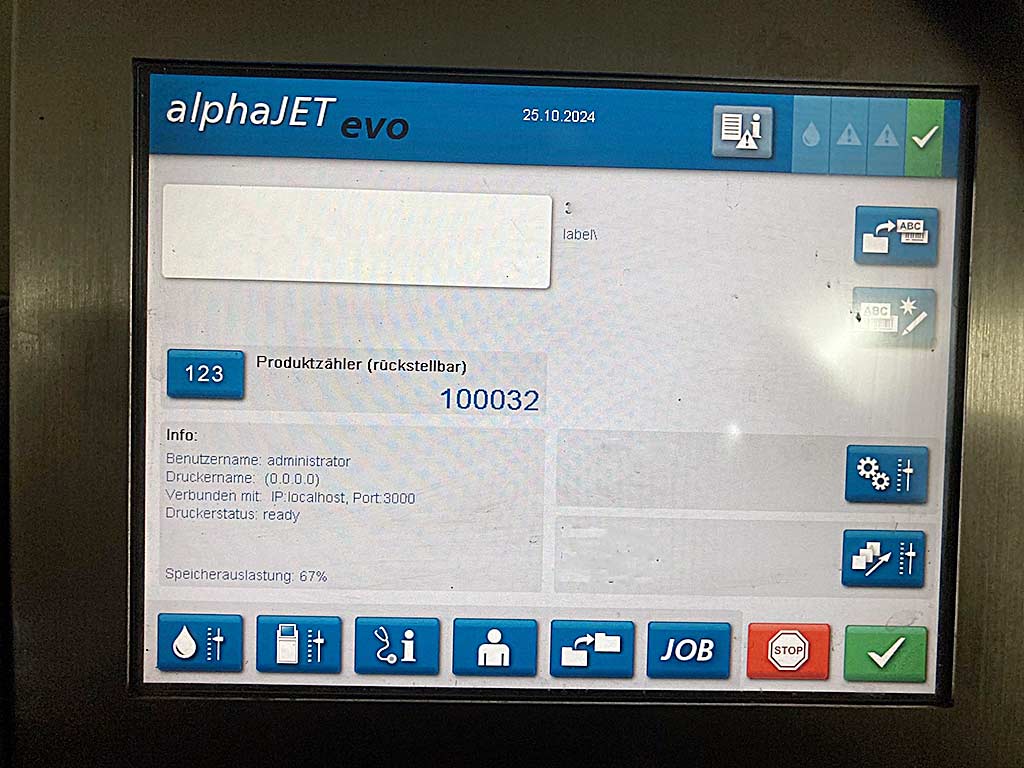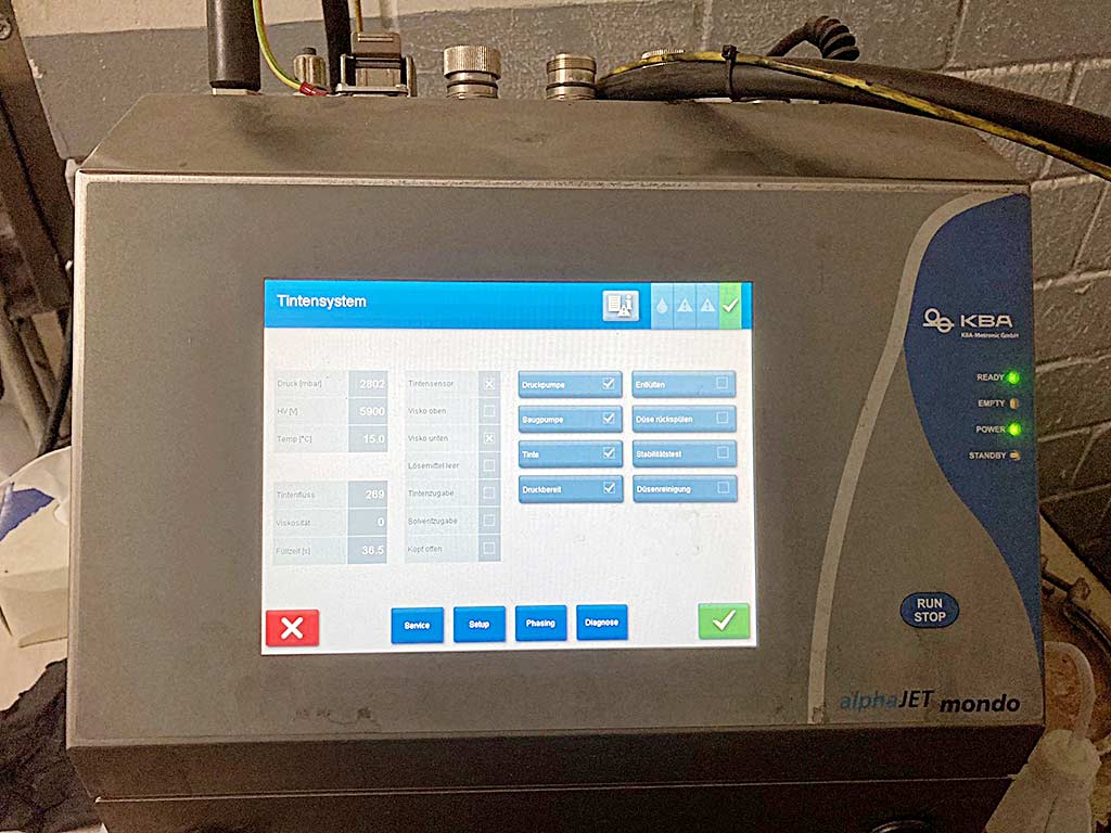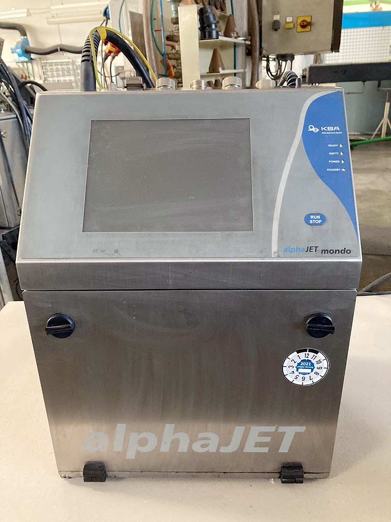 有 3 台 KBA 喷墨打印机可用。1) 高宝 alphaJet EVO,制造年份:2011 年,打印高度范围:0.8 毫米-15 毫米,最大打印速度:460 米/分钟,最大打印分辨率:48p,最大行数:8。2) 高宝 alphaJET mondo,制造年份:2014 年,最大线速度:780 米/分钟,最大线数:5,喷嘴直径:62 微米,机器尺寸 X/Y/Z:约 455 毫米/350 毫米/290 毫米, 重量:约 20 公斤。3) 高宝 alphaJET C(双头)。可用的文档。可以进行现场检查